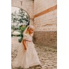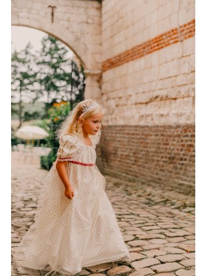 Made of beautiful off-white taffetas and precious Tull with gold highlights, it's decorated with an elegant velvet ribbon.