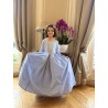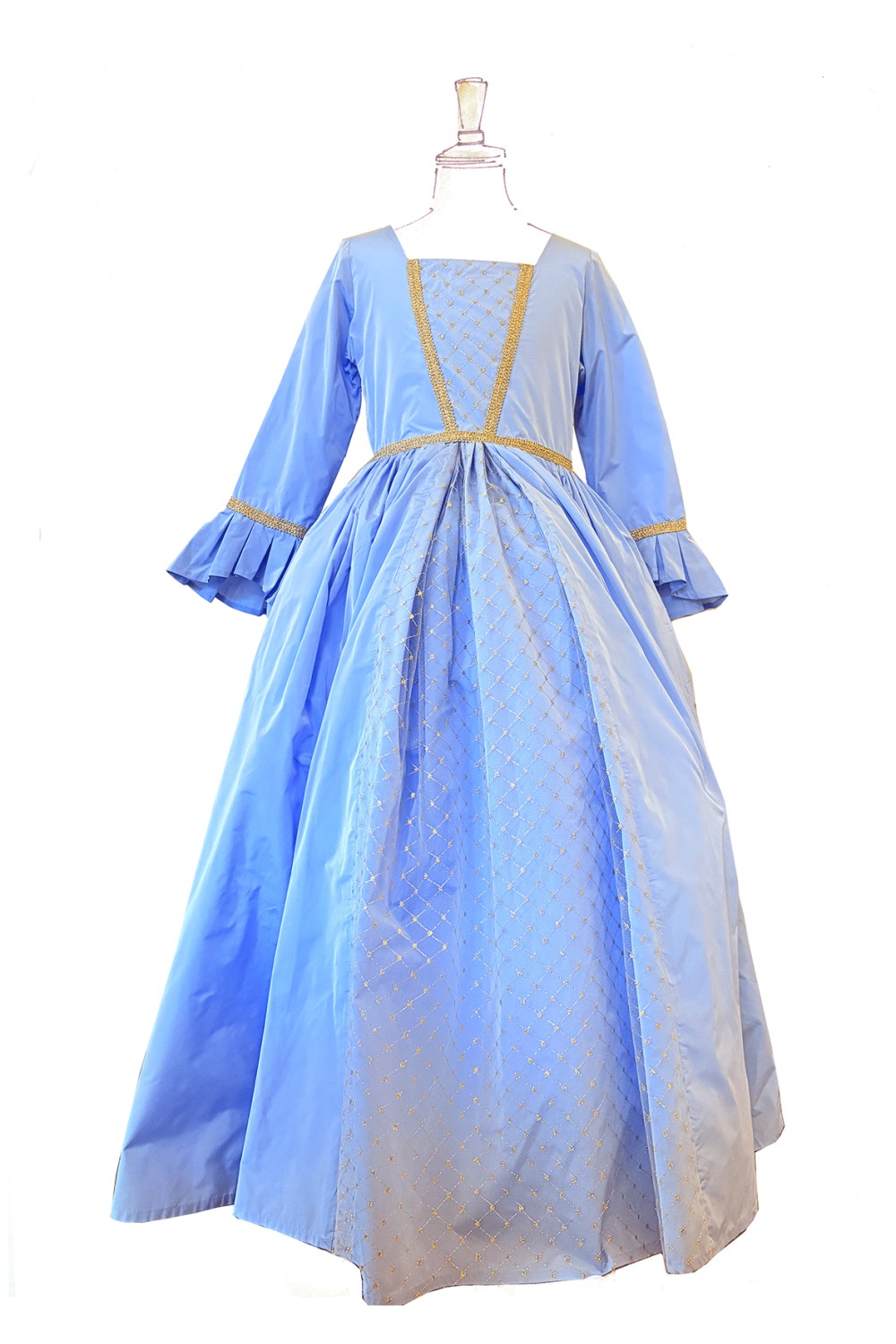 Blue taffeta dress, adorned with gold tulle and golden braid.