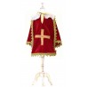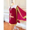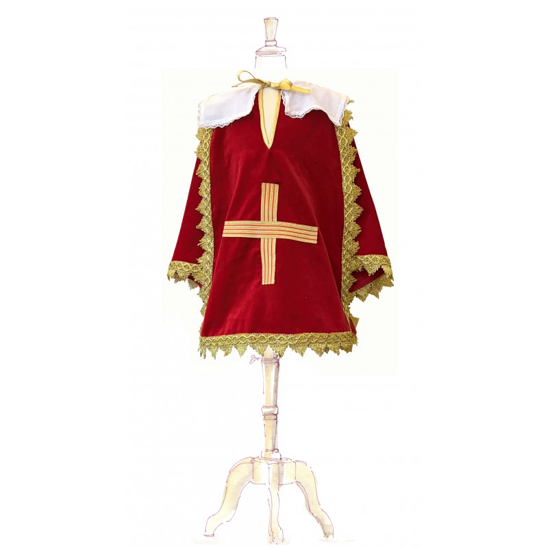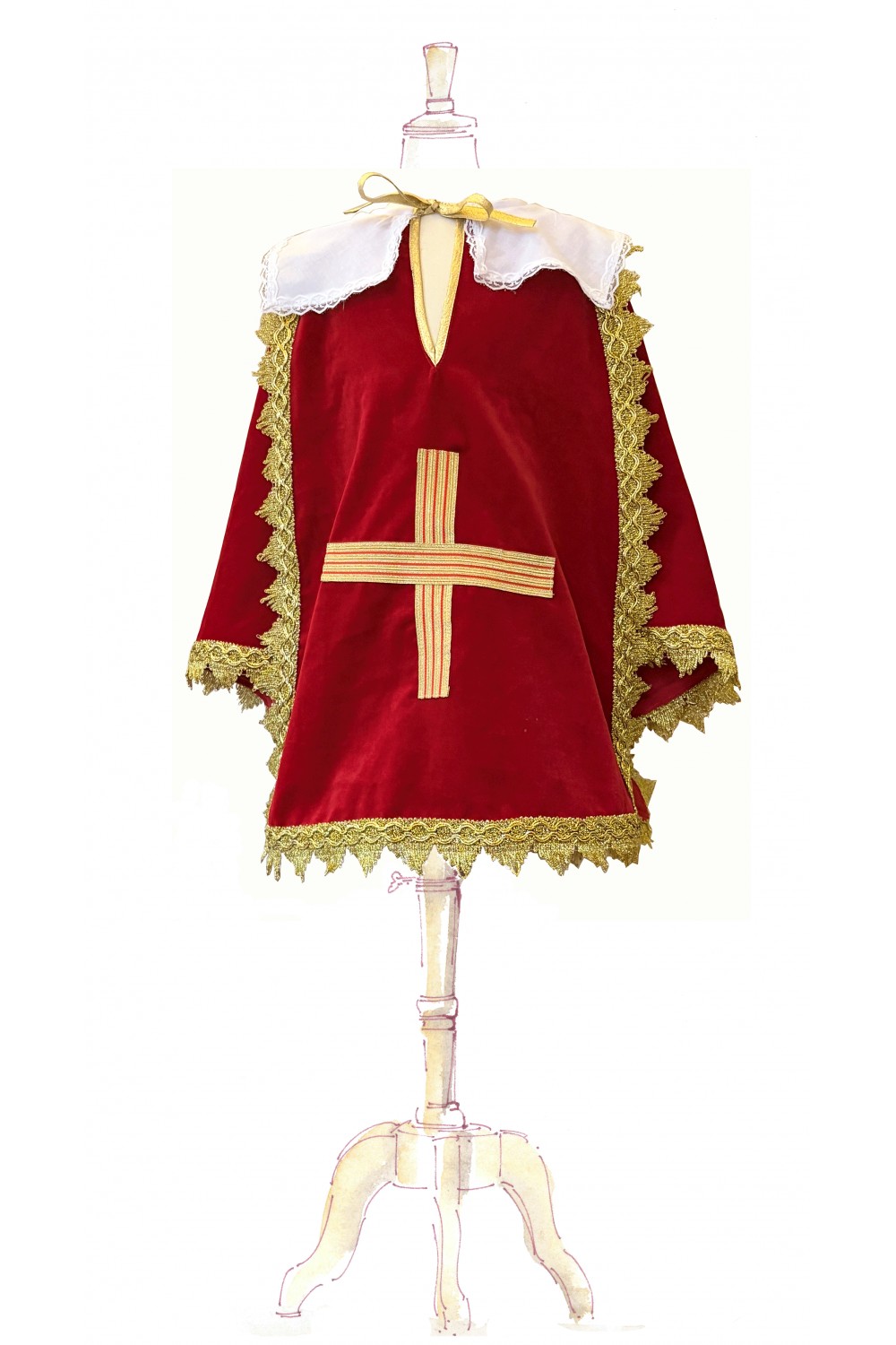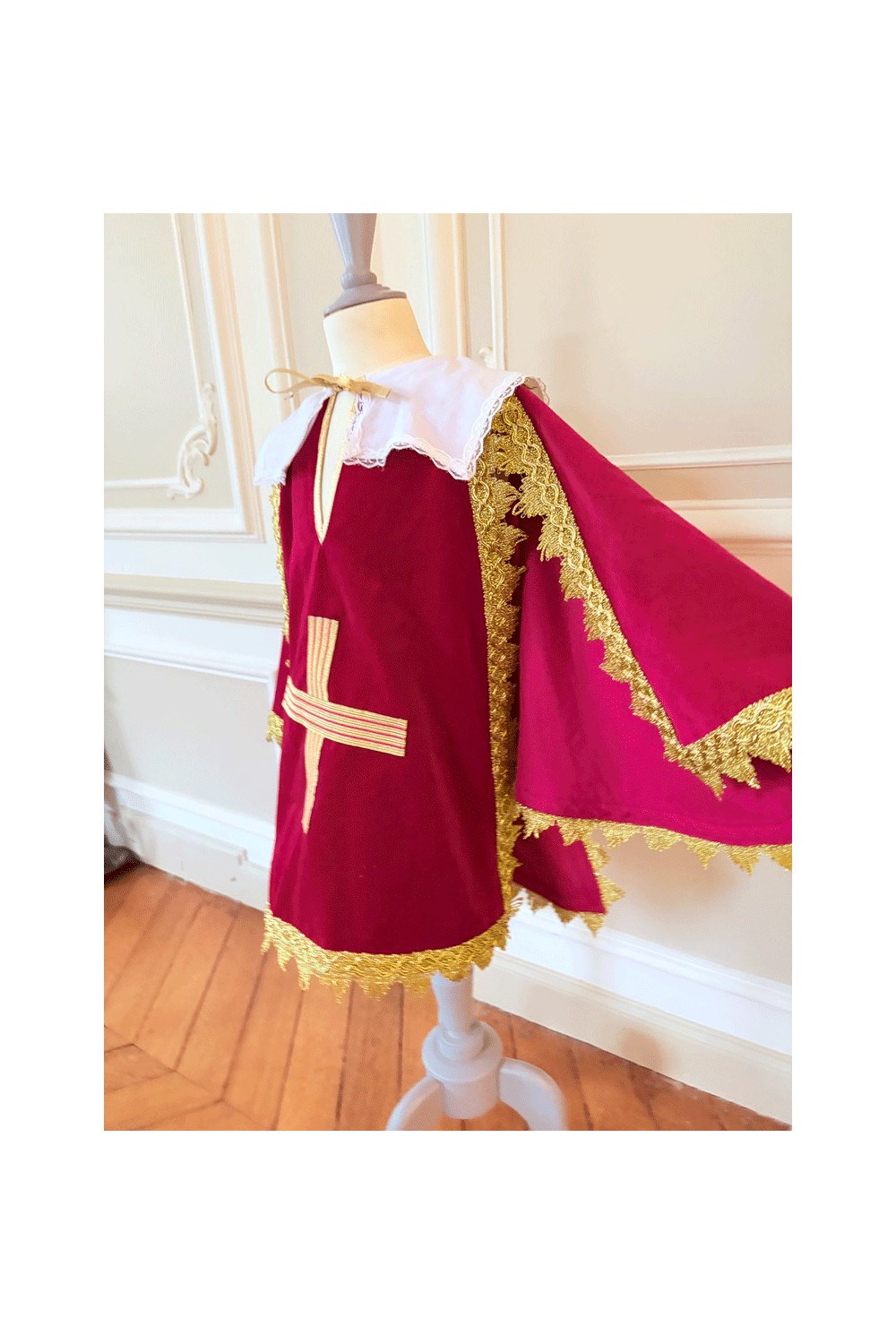 Costume de mousquetaire en velours de coton rouge bordé de galon or, orné d'une belle croix rouge et or et décoré un col incorporé.
